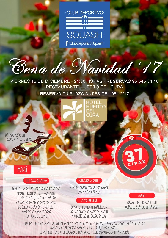Cena de Navidad 2017 ¡Nos merecemos una cena! Viernes 15 de Diciembre 21´30 horas Grupo Huerto del Cura Podéis confirmar vuestra asistencia en la recepción del Club o por teléfono en el 965.45.34.46